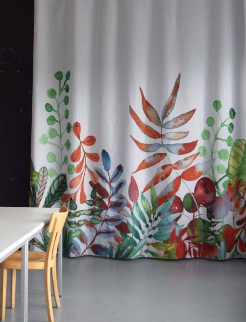 The functional curtains protect buildings from glare and heat. The print designs are inspired by painting strokes and colour spreading, transparency, nature growth, fairytales and fantasy.